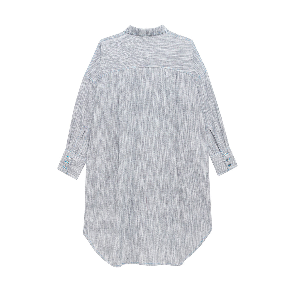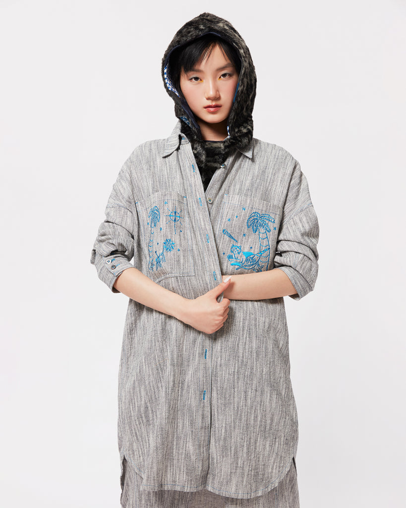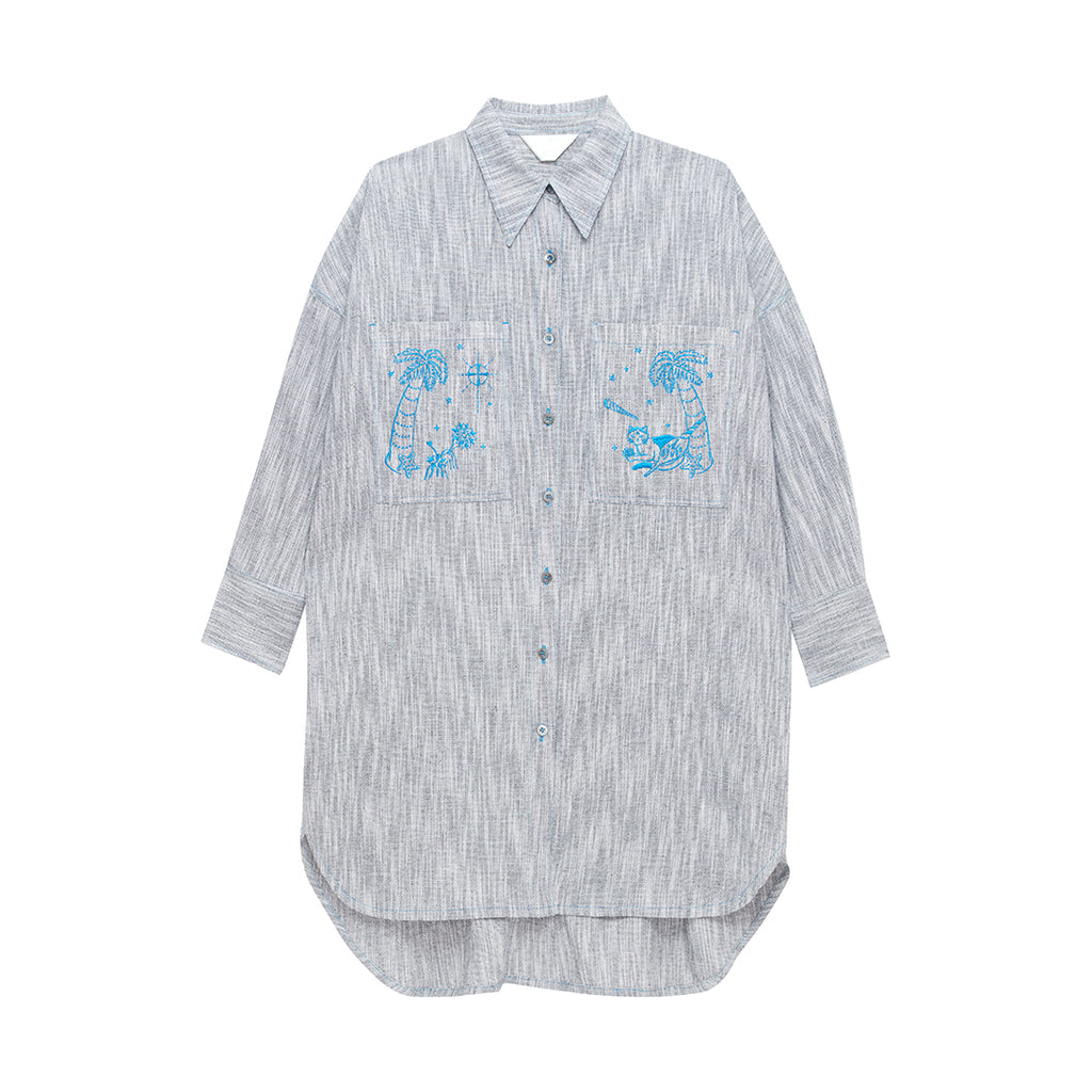 デザイナーによるイラスト刺繍とコントラストカラーのステッチが目を引く、シンプルなシャツワンピース。
